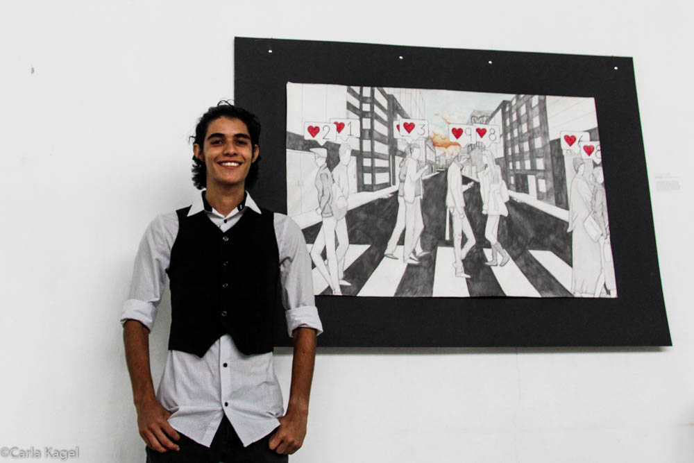 [/et_pb_text][/et_pb_column][/et_pb_row][et_pb_row column_structure=”1_2,1_2″ _builder_version=”3.26.7″][et_pb_column type=”1_2″ _builder_version=”3.26.7″][et_pb_image src=”https://www.futuro-verde.org/wp-content/uploads/2019/10/IMG_4388.jpg” admin_label=”Foto Mateo” _builder_version=”3.26.7″][/et_pb_image][et_pb_image src=”https://www.futuro-verde.org/wp-content/uploads/2019/10/IMG_4317.jpg” admin_label=”Image Elian” _builder_version=”3.26.7″][/et_pb_image][et_pb_image src=”https://www.futuro-verde.org/wp-content/uploads/2019/10/IMG_4373.jpg” _builder_version=”3.26.7″][/et_pb_image][/et_pb_column][et_pb_column type=”1_2″ _builder_version=”3.26.7″][et_pb_text admin_label=”Text Mateo” _builder_version=”3.26.7″]Titulada “Tiquicia En Línea”, la exhibición de Mateo fue una exploración de las redes sociales y del impacto de la tecnología y el desarrollo en nuestra comunidad rural perteneciente al “tercer mundo”. En su fundamentación curatorial escribe lo siguiente: “Mis obras de arte intentan exponer las suposiciones negativas que las redes sociales emplean para intentar incentivar a las personas revelando lo especial que es enfocarse en ser una persona ética en lugar de ser bello; ser diferente y original en lugar de estar a la moda y disfrutar de las cosas pequeñas en lugar de desear una vida opulenta”.