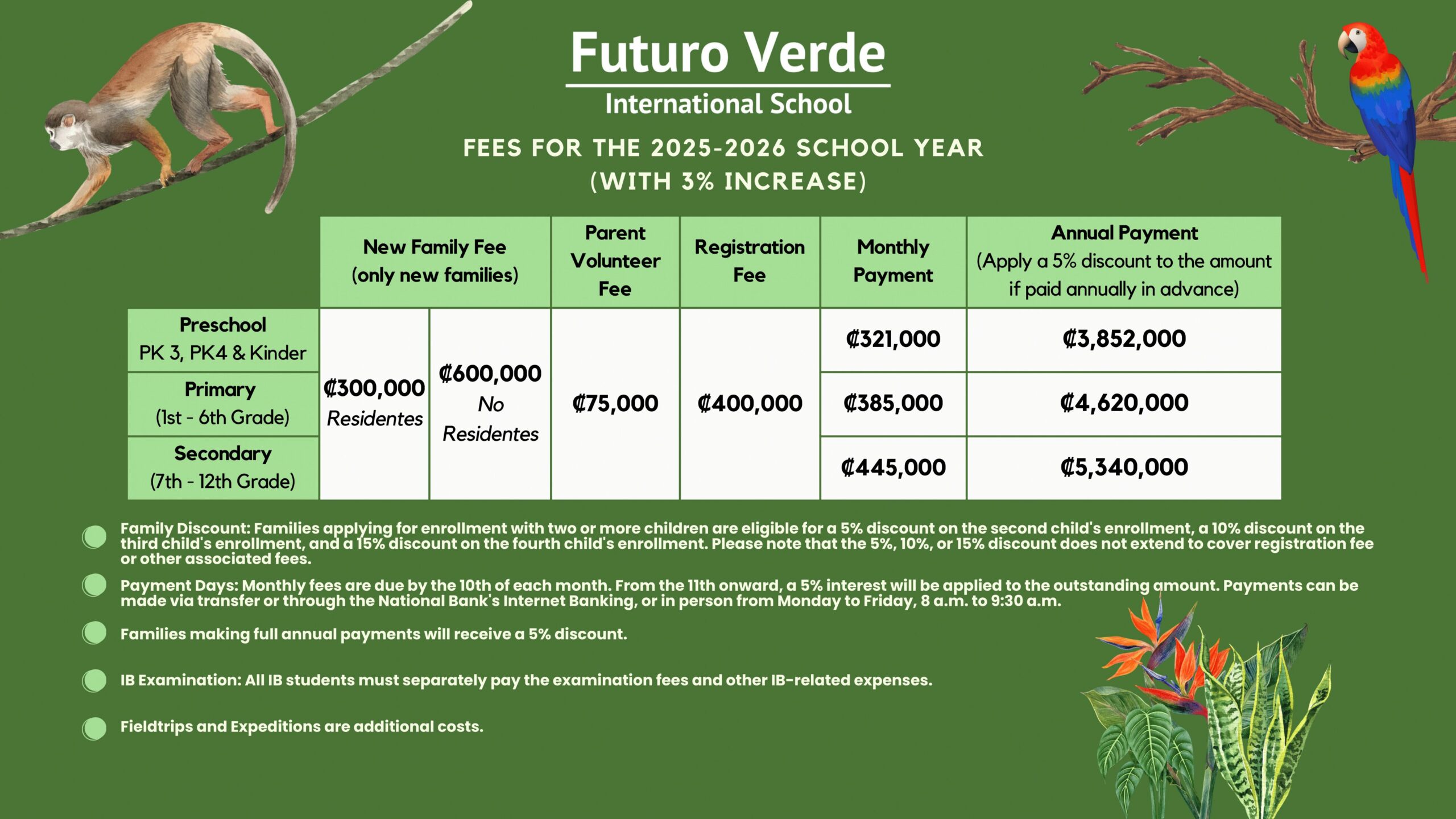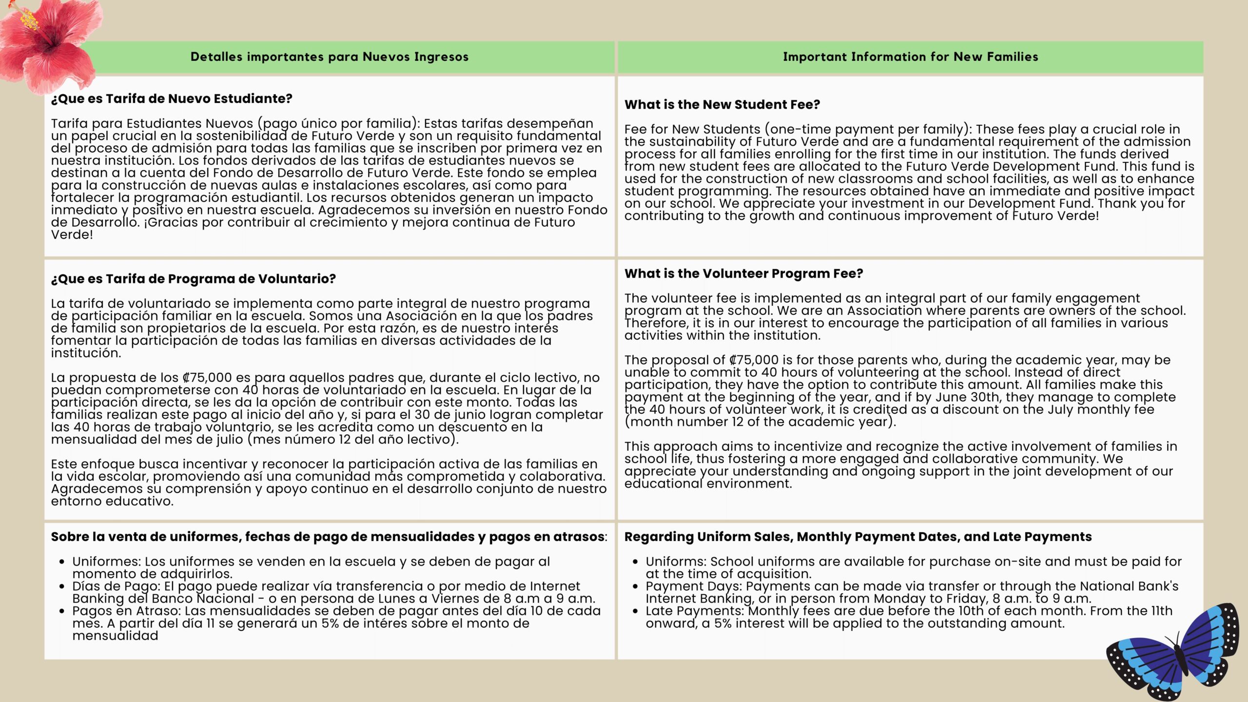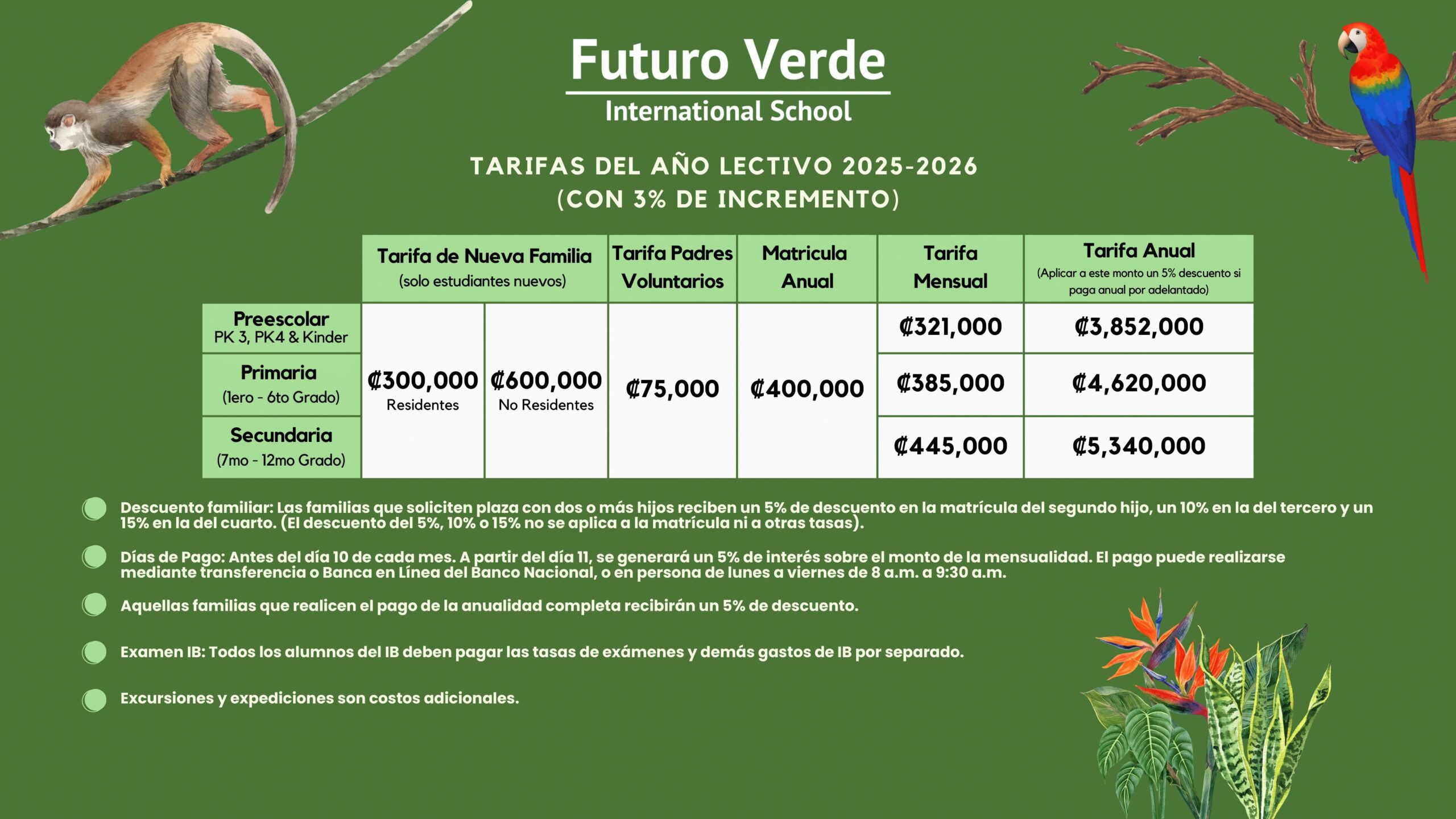 DÉCIMO PRIMERA - PAGOS: El Representante se obliga y acepta pagar, en el domicilio del Centro Educativo Futuro Verde o mediante internet banking, una tarifa anual que podrá ser dividida en 12 cuotas mensuales consecutivas, pagaderas antes del 5 de cada mes; un solo pago por concepto de MATRÍCULA, un pago de cuota de Voluntariado y un pago de Nueva Familia (para estudiantes de 1er ingreso) mediante los procedimientos establecidos por el Centro Educativo Futuro Verde. El monto de matrícula, monto de nueva familia y de mensualidades no será reembolsable en ningún caso. La falta de pago total de la matrícula libera al Centro Educativo Futuro Verde de obligación en cuanto a la reserva del cupo para el próximo curso lectivo. Ver Apéndice 1: Tarifas 2025-2026.